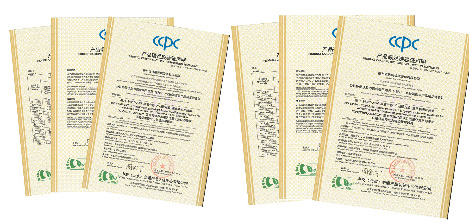 近日,中交(北京)交通产品认证中心有限公司(以下简称“CCPC”)依据GB/T 24067-2024和ISO 14064-3:2019等国家或国际相关标准,独立完成了对柳州欧维姆机械股份有限公司和柳州市桥厦科技发展有限公司生产的公路桥梁预应力钢绞线用张拉端圆锚产品碳足迹验证工作。标志着交通基建领域全生命周期碳管理能力的突破,也为交通行业提供了可量化的碳足迹核算范本。