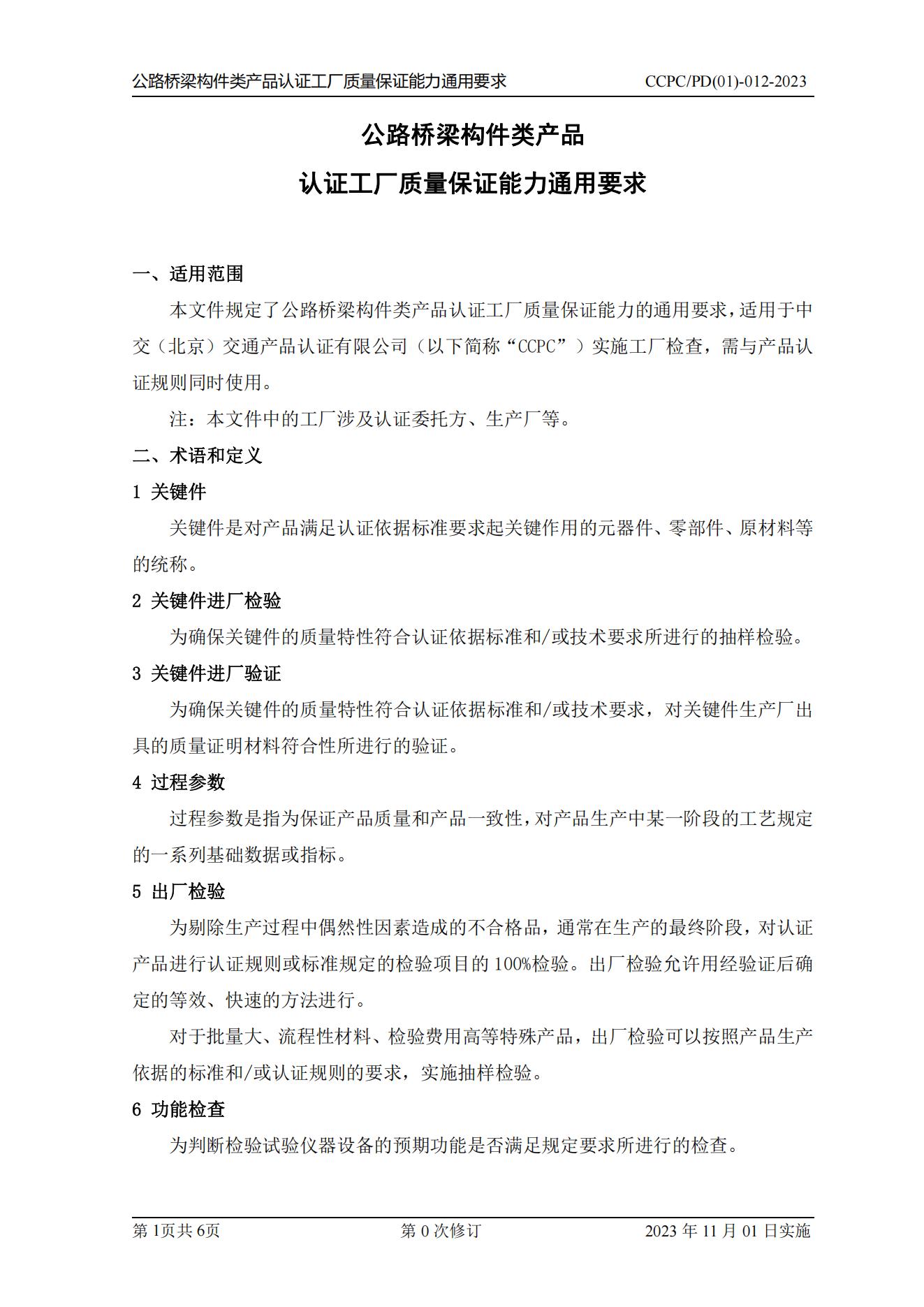 公路桥梁构件类产品认证工厂质量保证能力通用要求CCPC/PD(01)-012-2023