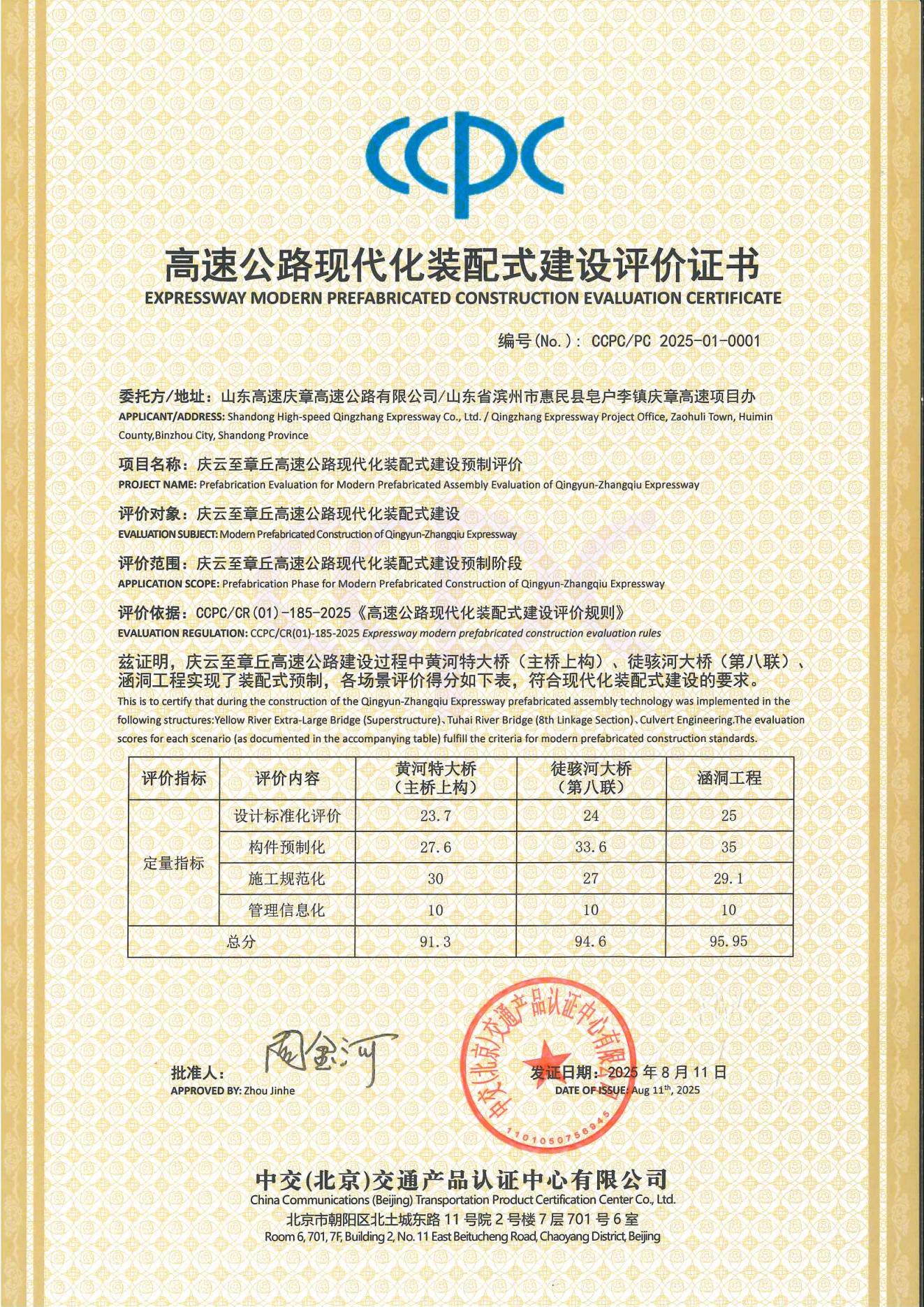 近日,交通产品认证中心(CCPC)正式向山东高速庆章高速公路有限公司颁发了编号为CCPC/PC 2025010001的《高速公路现代化装配式建设评价证书》,标志着庆云至章丘高速公路(以下简称“庆章高速”)在现代化装配式建设方面达到行业领先水平,成为全国首条通过该项权威评价的高速公路项目。