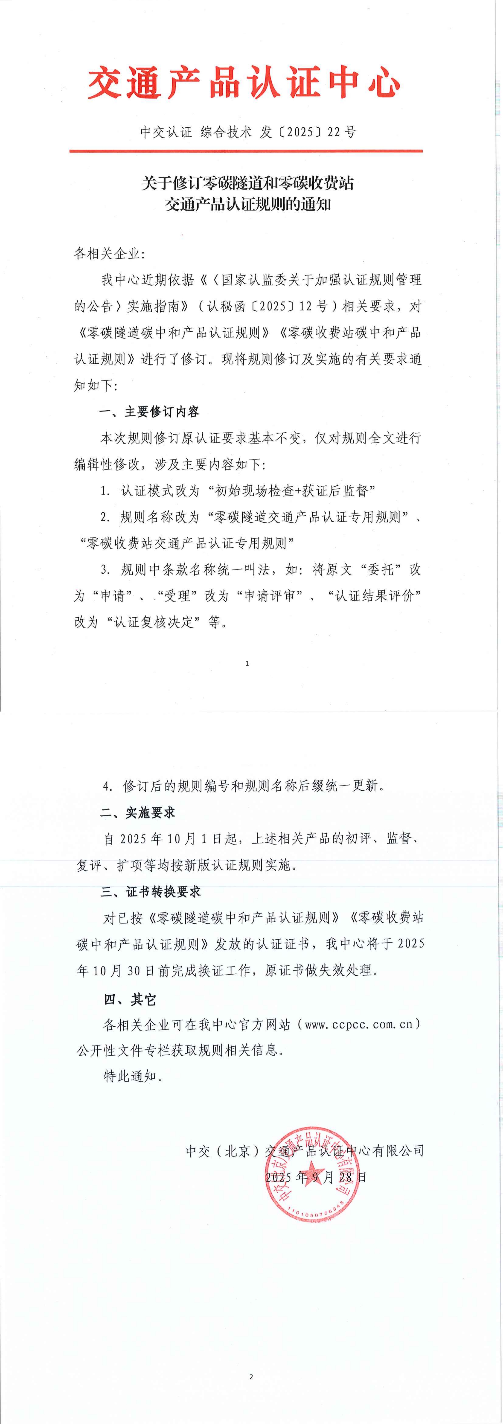 关于修订零碳隧道和零碳收费站交通产品认证规则的通知