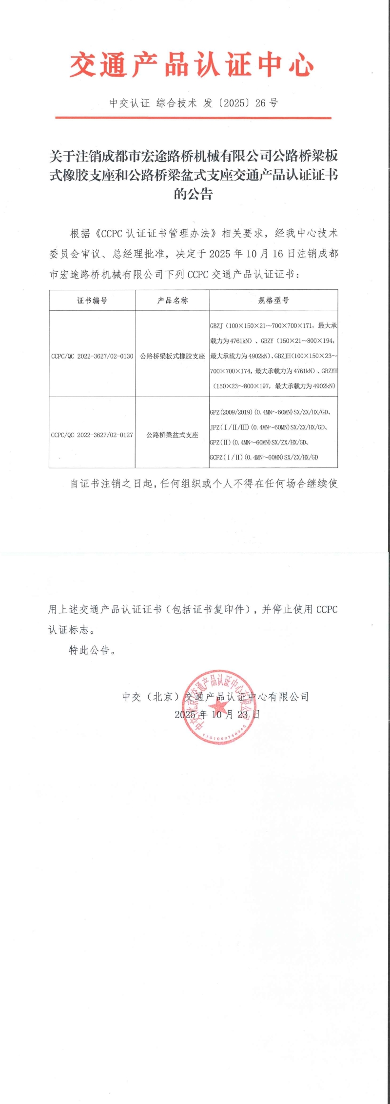 关于注销成都市宏途路桥机械有限公司公路桥梁板式橡胶支座和公路桥梁盆式支座交通产品认证证书的公告
