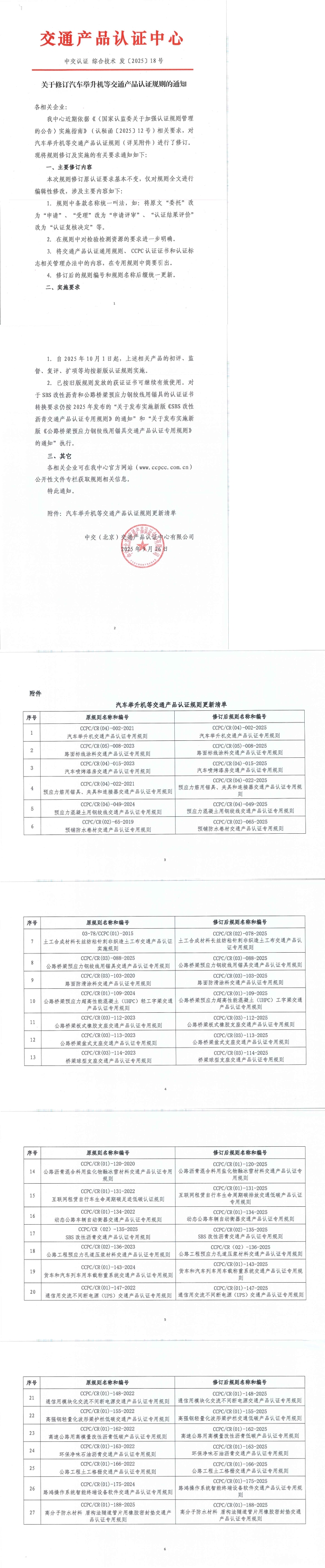 关于修订汽车举升机等交通产品认证规则的通知