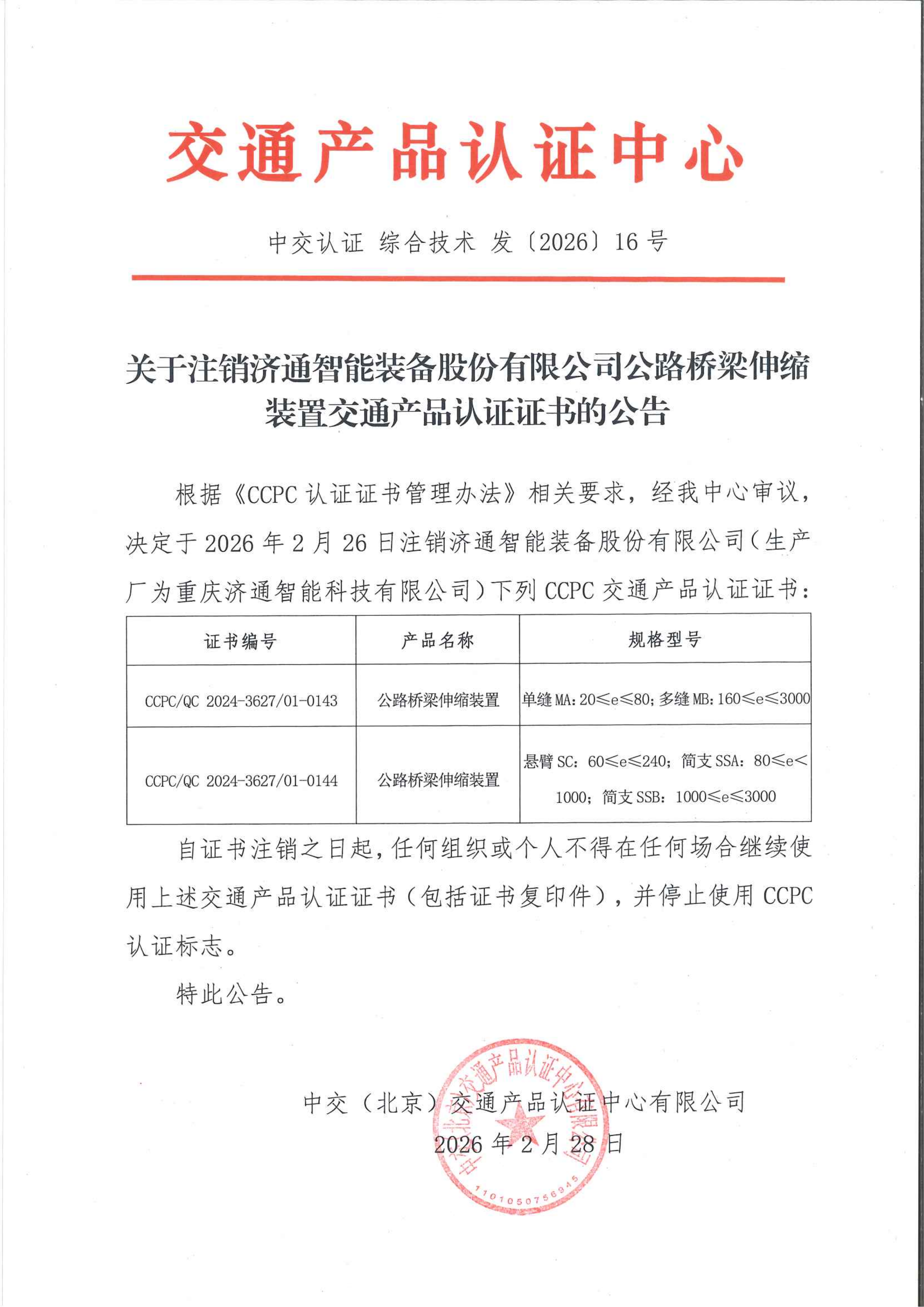 关于注销济通智能装备股份有限公司公路桥梁伸缩装置交通产品认证证书的公告