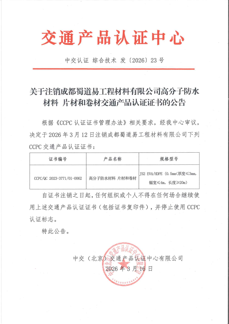 关于注销成都蜀道易工程材料有限公司高分子防水材料 片材和卷材交通产品认证证书的公告