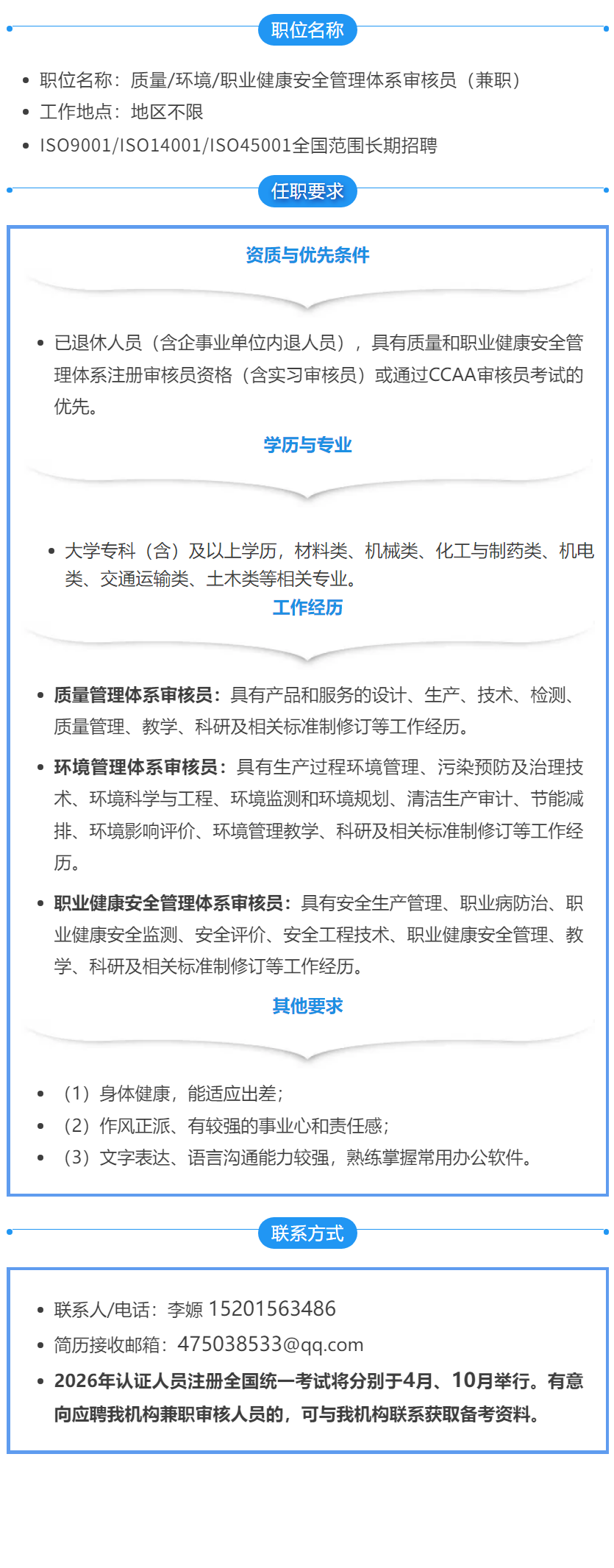 【招聘公告】质量/环境/职业健康安全管理体系审核员